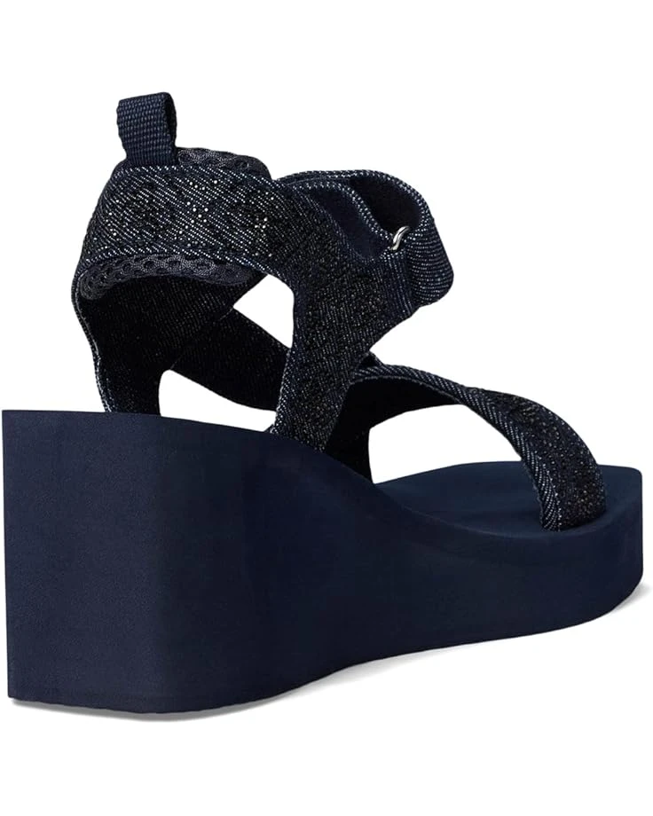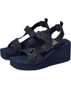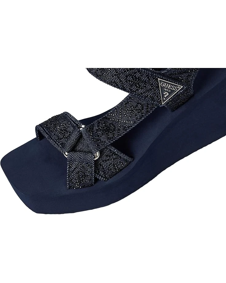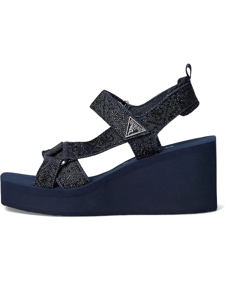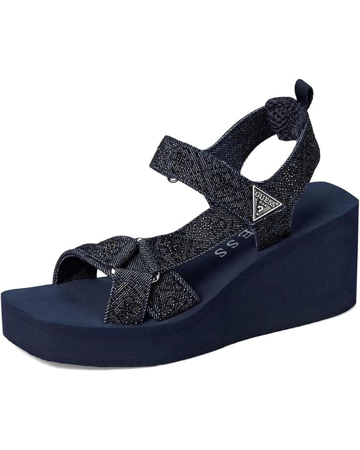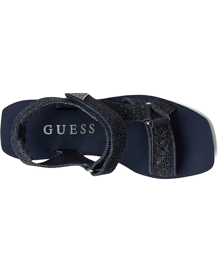 - GUESS puts its signature stamp on the Dasein EVA sandals. This GUESS® Dawsin sandals of the warm-weather is adorned with rhinestone embellished straps on top of a comfortable wedge heel. Est. 1981, Guess is a global lifestyle brand and a symbol of a young, adventurous lifestyle. Crafted from denim upper, textile lining, and padded footbed.