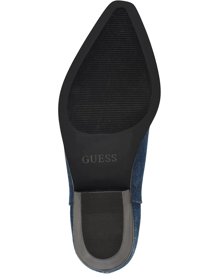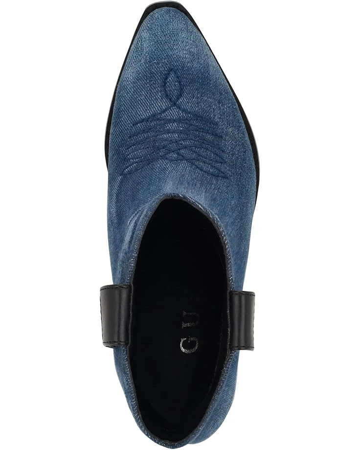 - Style up your outfits and looks wearing the GUESS® Ginette boots. The denim upper of these boots features tonal stitching patterns that offer a chic look. These fashionable boots come with a padded footbed and fabric lining that keep your feet comfortable all day. The pull loops at the side make them easy to slip on and off. Add a fashion-forward look to your everyday looks and casual styles wearing these heeled boots.