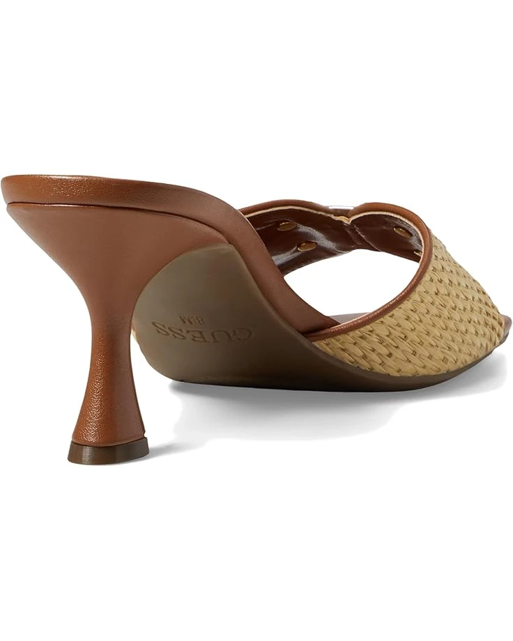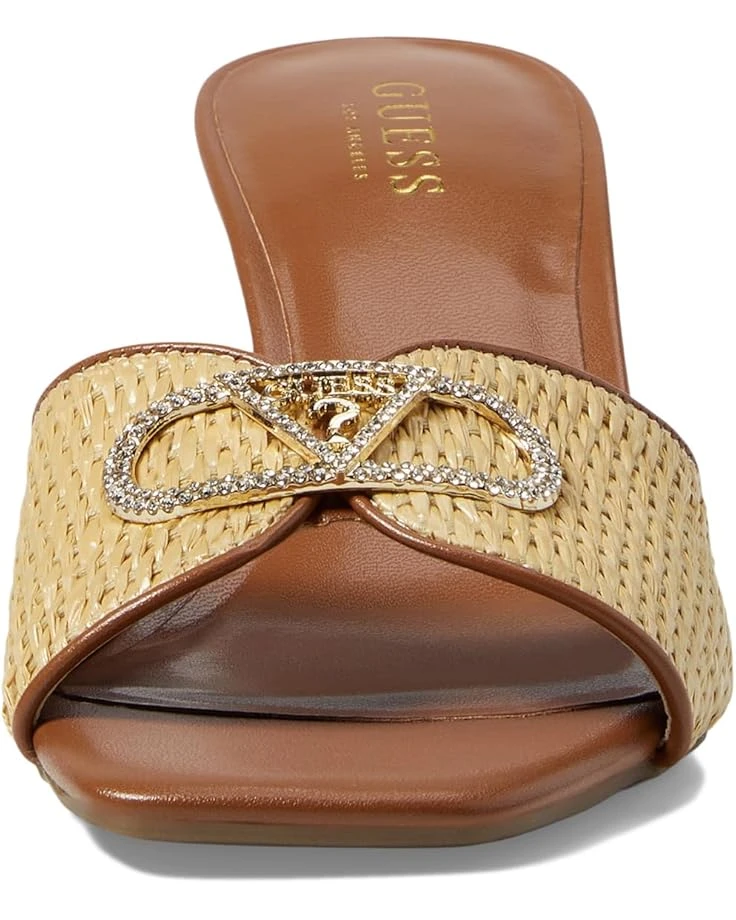 - Wear it high and own the night wearing the GUESS® Olins. Crafted from PU upper and PU lining, this pair of sandals features open square toe, slip-on closure, raffia and rhinestone detailing on the top and stiletto heel for an elevated look.