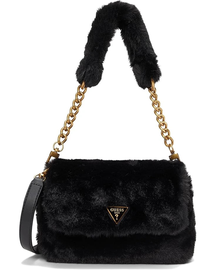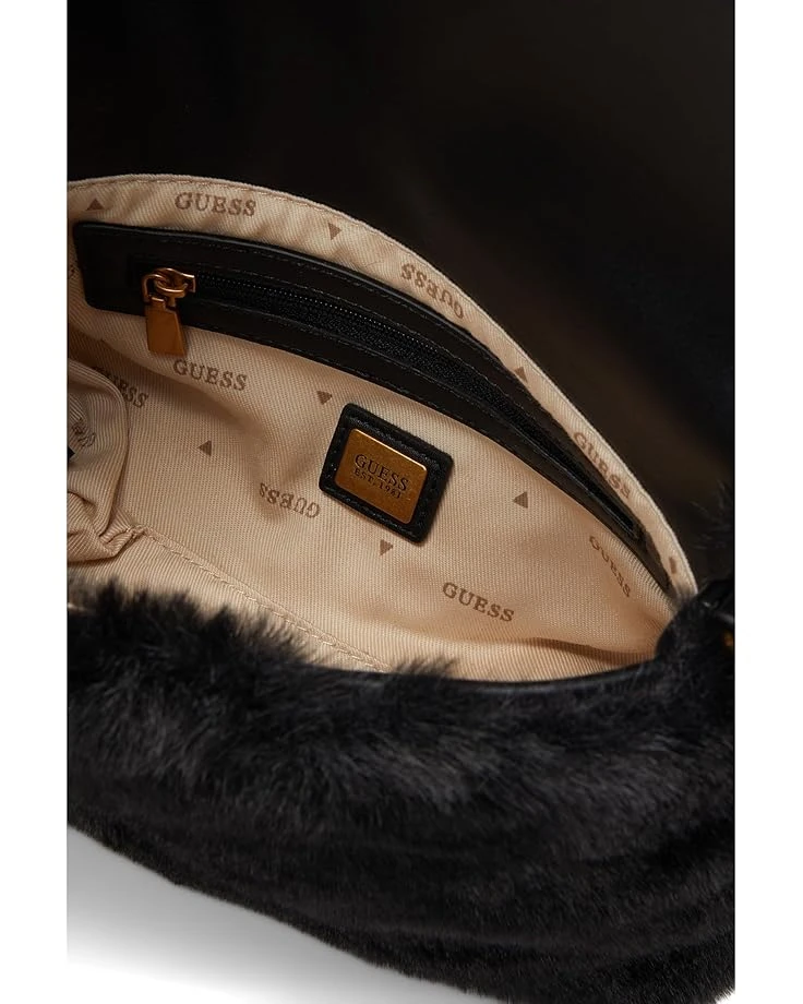 - The GUESS® Samia Flap Shoulder Bag boasts faux fur construction with antique bronze hardware offering a luxe appeal. It has one compartment with flap magnetic closure and an interior zippered pocket. The adjustable/removable crossbody strap makes carrying the bag a breeze.