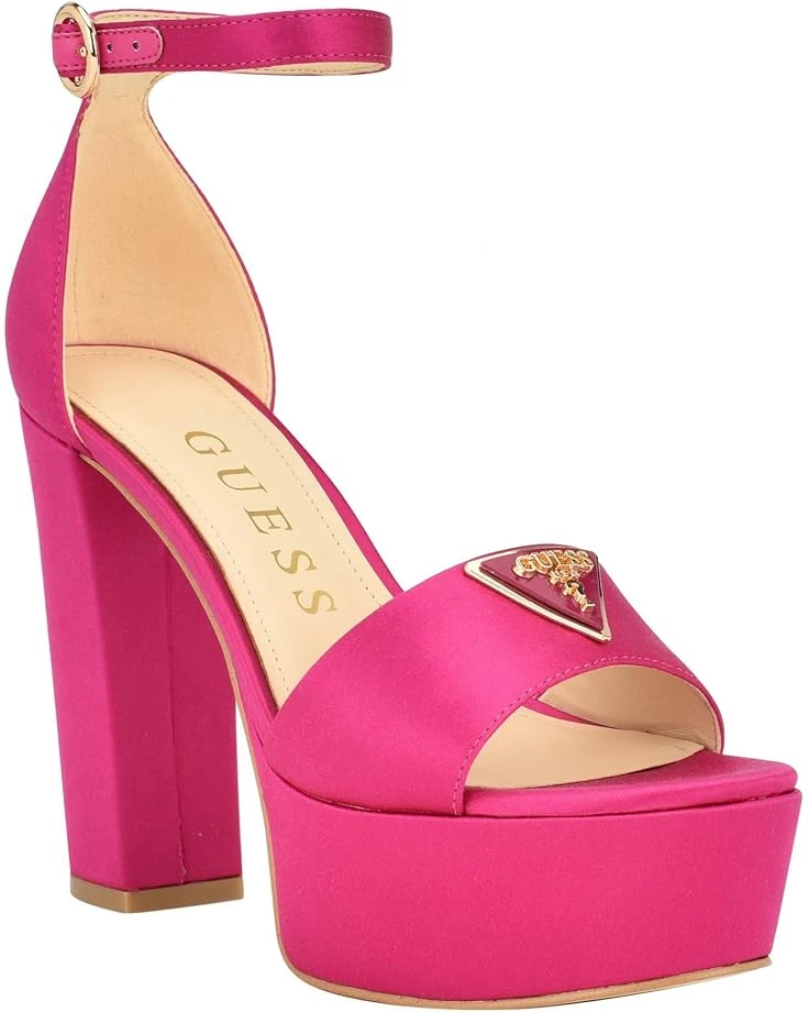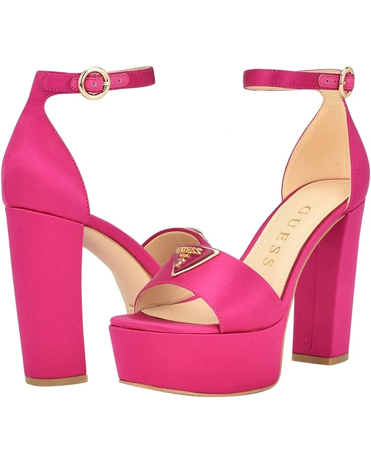 - Set a hallmark of your sophisticated fashion game as you make an entry wearing the GUESS® Seton Heels. These are sculpted in an open almond toe silhouette with a satin upper, a man-made lining, and a lightly padded insole. The embossed logo accent on the toe strap enhances the appeal of these shoes while the towering block heel adds some extra height to your style.