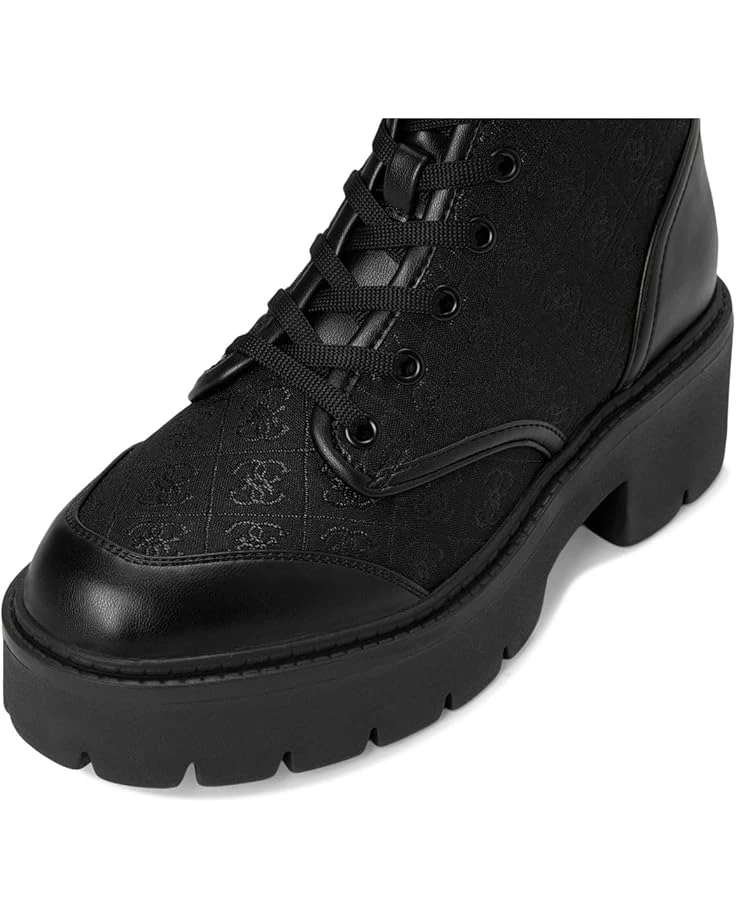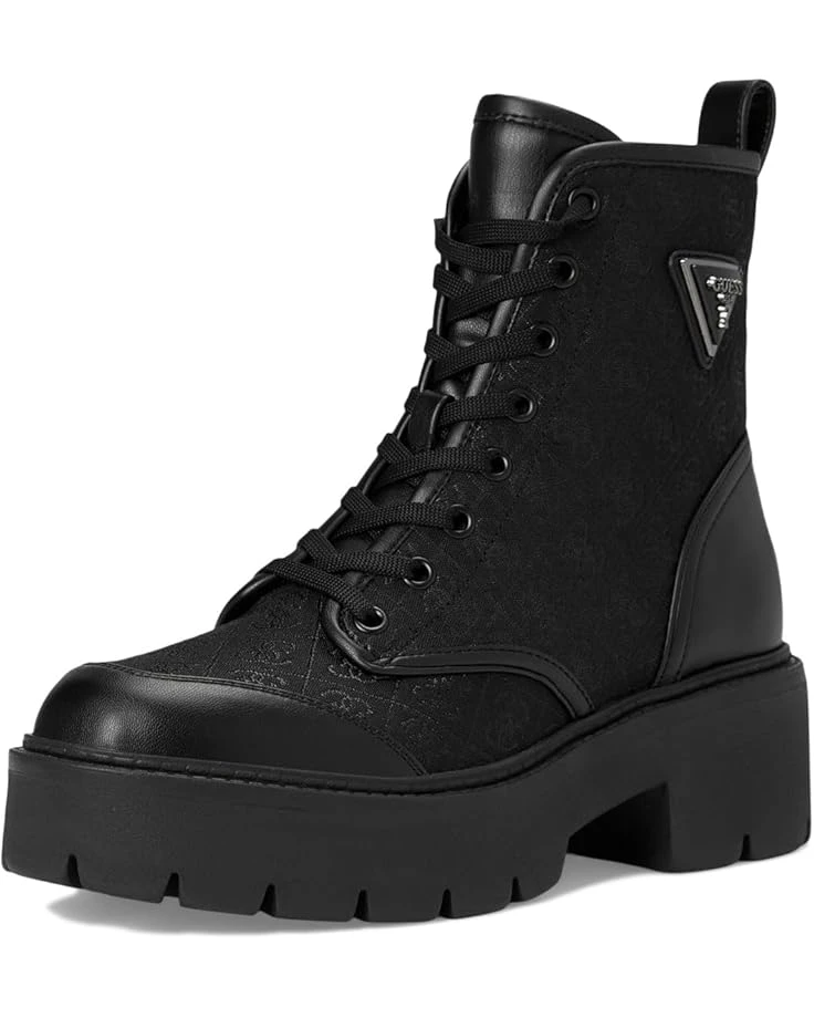 - The GUESS® Shun gives the signature combat look everyone loves but in a new trendy way. Featuring a chunky lug sole, the rounded toe booties boast outside zippers accenting the cool lace-up look. This ankle-high footwear has a back pull tab and stacked block heel for added perfection.