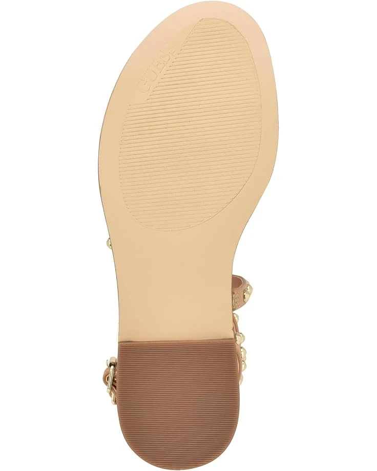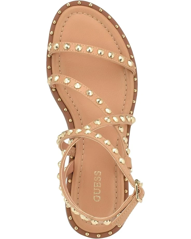 - Discover the essence of timeless elegance and confident style by opting for the GUESS® Yamara Flats. Perfect for evening parties as well as tropical getaways, these sandals are defined by a gladiator-style strappy faux leather upper punctuated with gleaming dome-shaped studs. The padded insole offers all-day comfort while the dual buckle closures ensure that you get an adjustable fit.